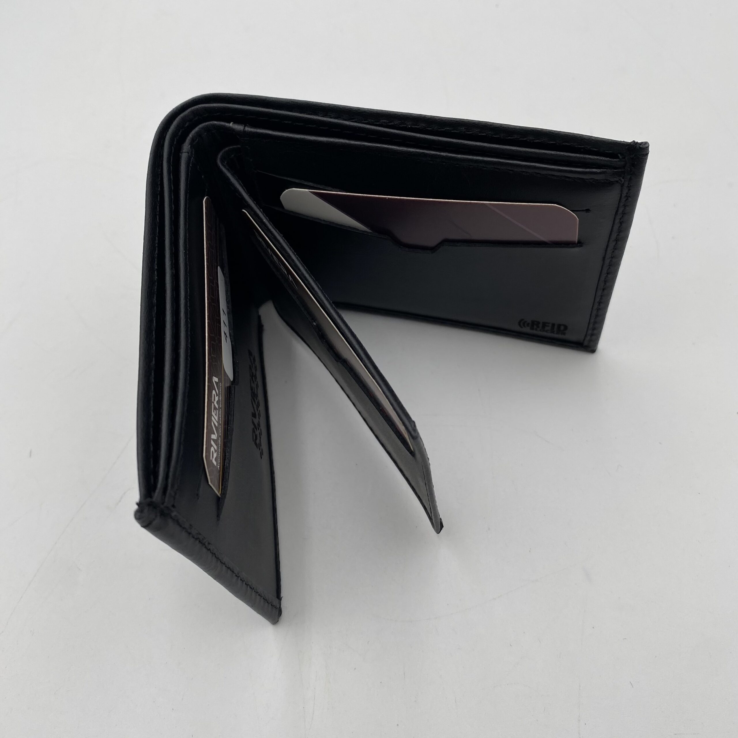 Calidad nacional, tecnología ReFit, cuero, múltiples tarjeteros, empaque metálico, 3 colores: café, azul oscuro y negro. Medidas: 10cm ancho X 8.5cm alto.
