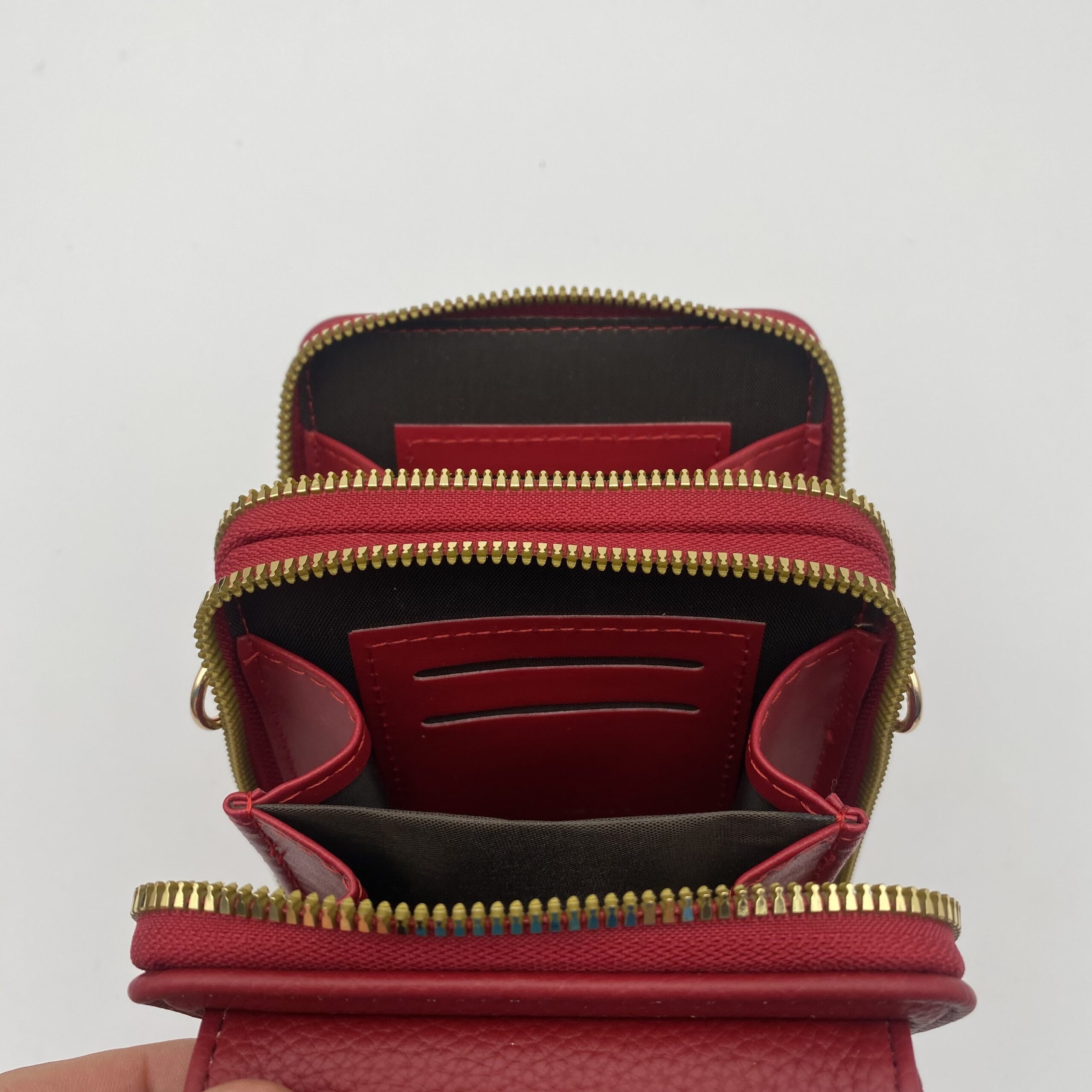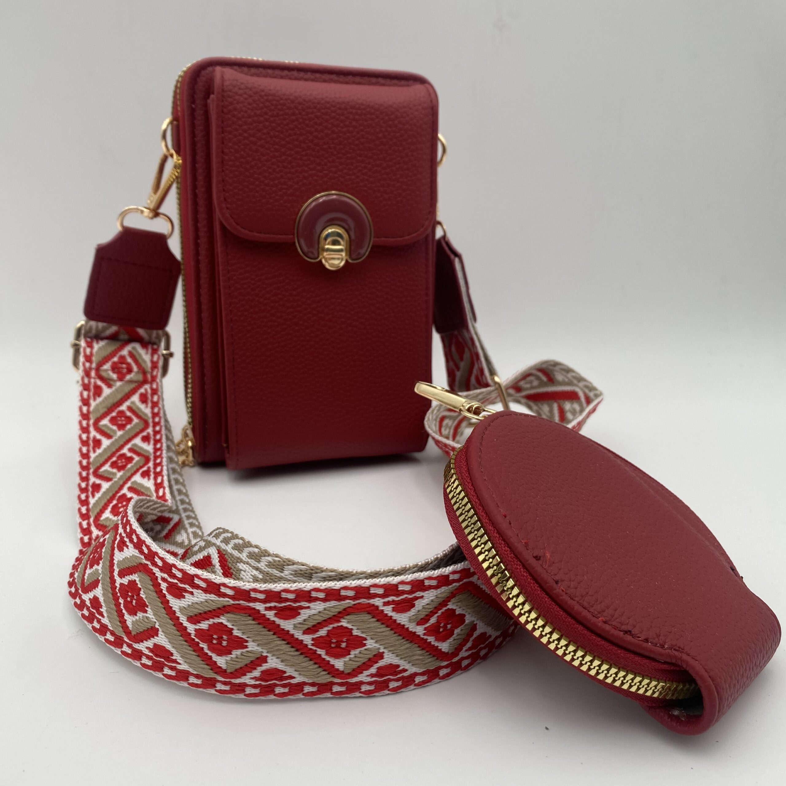 Porta celular dama nacional con monedero, calidad 100% nacional, material sintético, triple compartimiento, reata artesanal en algodón, incluye monedero como llavero. Medidas: 12cm ancho x 18 cm alto. 4 colores disponibles: rosa, negro, rojo y crema.