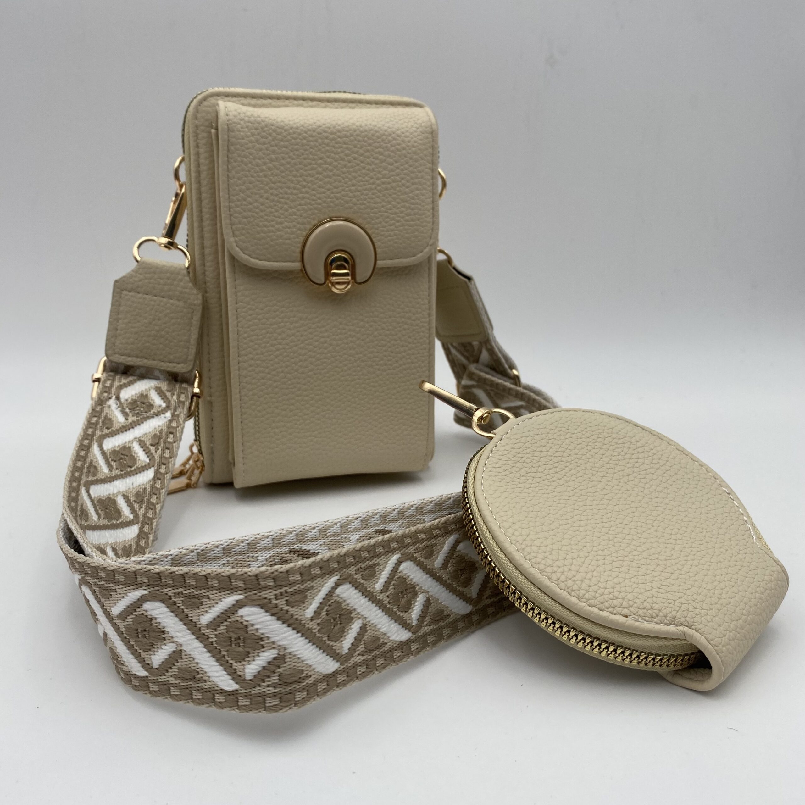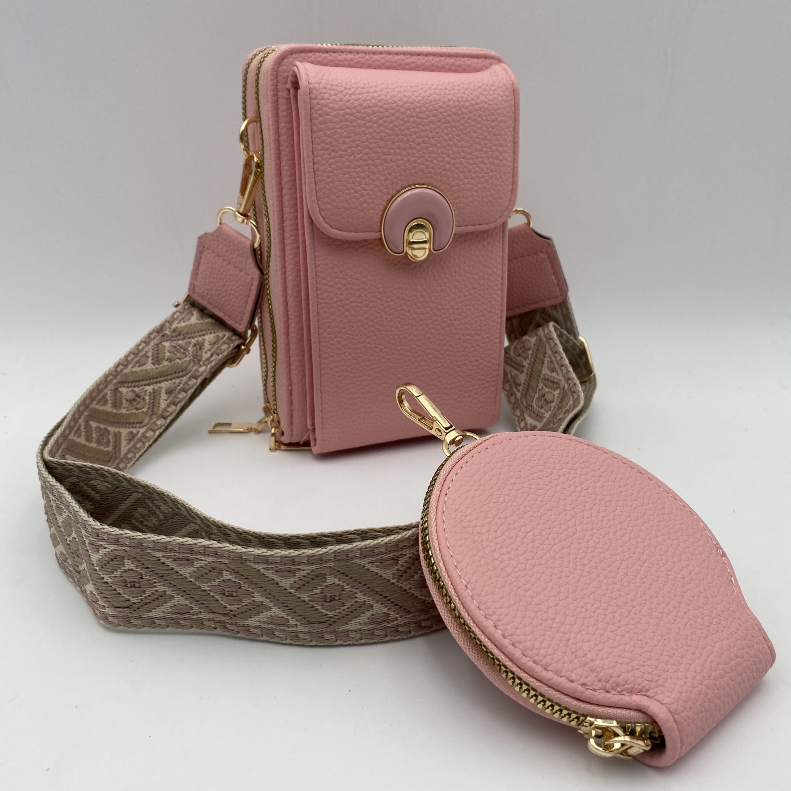 + Costos de EnvíoPorta celular dama nacional con monedero, calidad 100% nacional, material sintético, triple compartimiento, reata artesanal en algodón, incluye monedero como llavero.